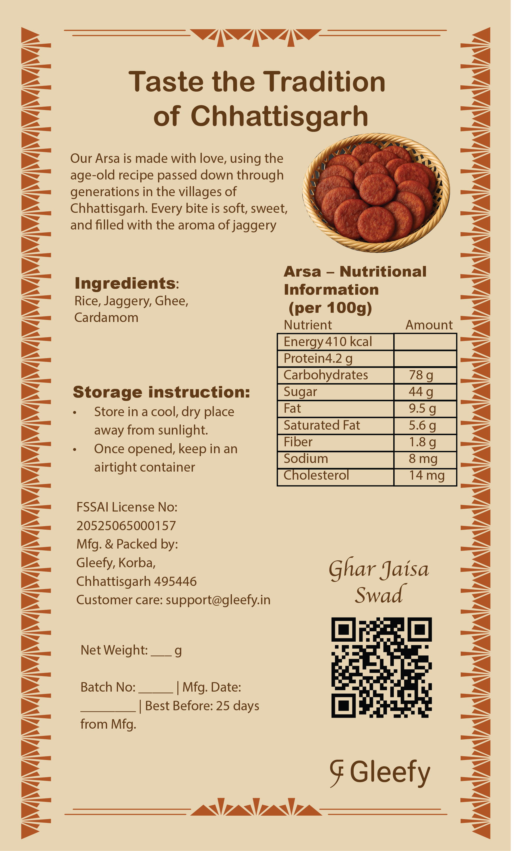 100% traditional Chhattisgarhi Arsa — no preservatives, no artificial colors, Freshly prepared in small batches, Hygienically packed & sealed